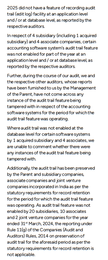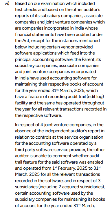 Based on our examination, which included test checks, and that performed by the respective auditors of the subsidiaries, associates and joint ventures/joint operations which are companies incorporated in India whose financial statements have been audited under the Act, except for the instances mentioned below, the company, subsidiaries, associates and joint ventures/joint operations have used an accounting software for maintaining its books of account which has a feature of recording audit trail (edit log) facility and the same has operated throughout the year for all relevant transactions recorded in the software. Further, during the course of our audit, we and respective auditors of the above referred subsidiaries, associates and joint ventures/joint operations did not come across any instance of audit trail feature being tampered with. Additionally, the audit trail